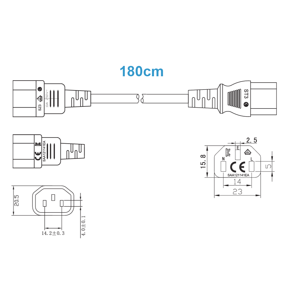 Rallonge d'alimentation secteur C13 vers C14, longueur 1.8m, utilisable internationale, 3 x 0.75mm²