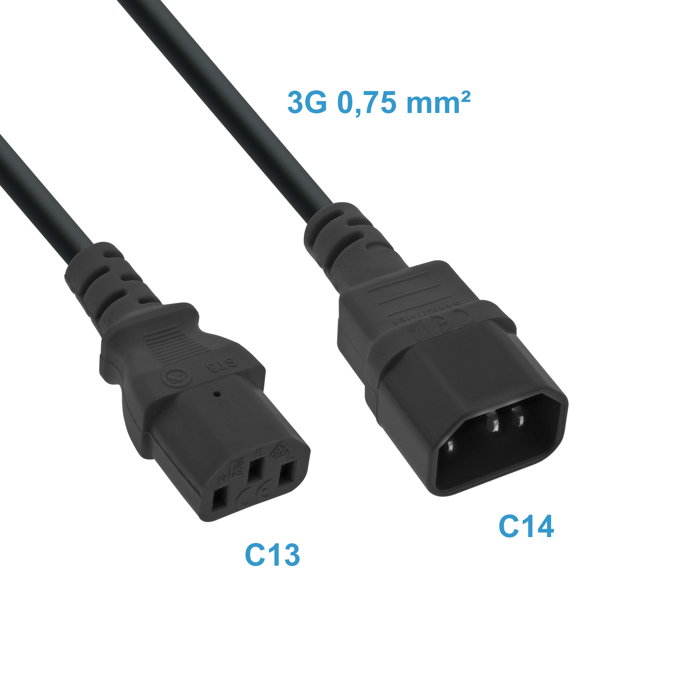 Rallonge d'alimentation secteur C13 vers C14, longueur 50cm, utilisable internationale, 3 x 0.75mm², VDE, NF, DEMKO, NEMKO, FINKO, KEMA, CEBEC, OVE, IMQ, SEV, SAA