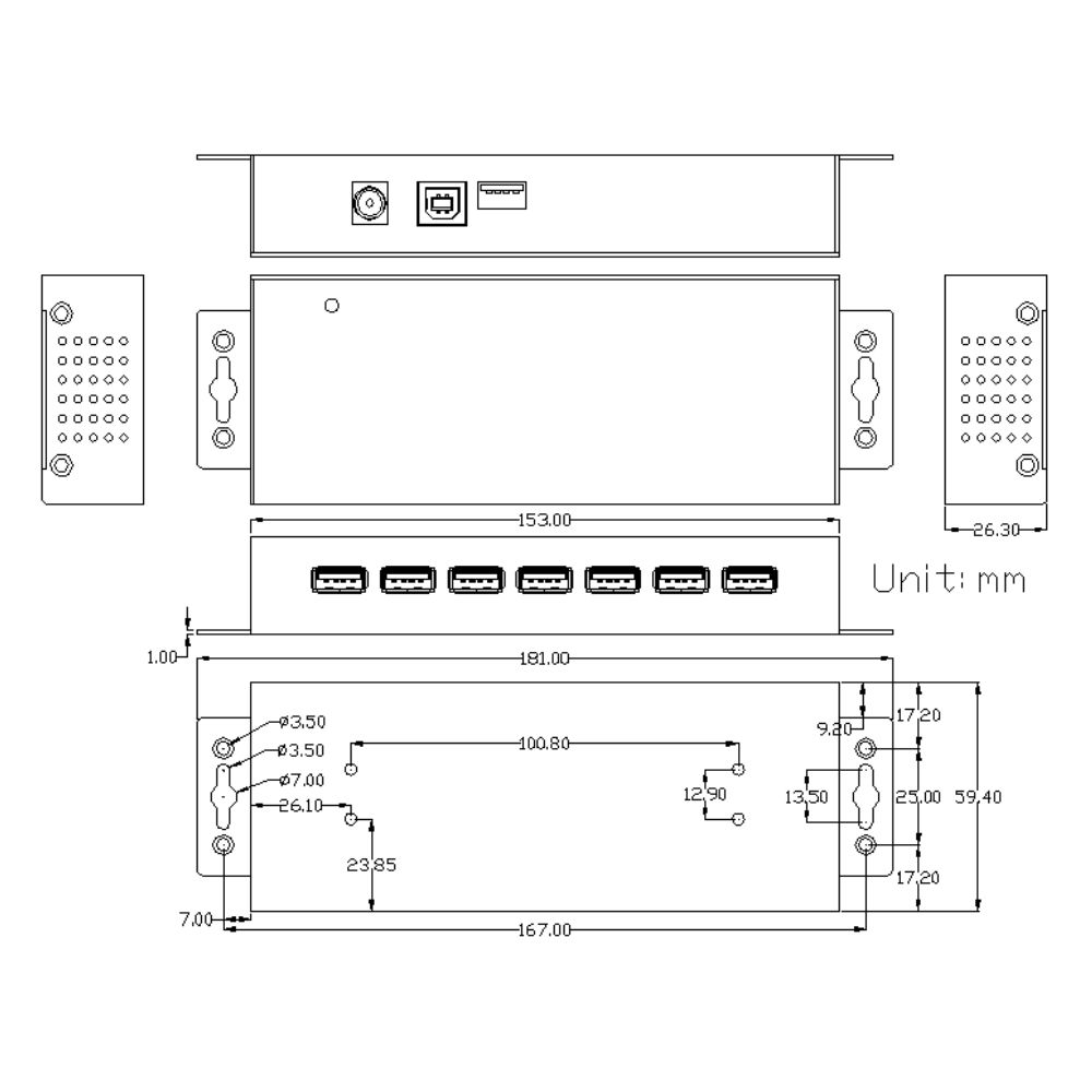 USB 2.0 HUB concentrateur 7 ports, pour utilisation industrielle (boîtier métallique), EXSYS EX-1178
