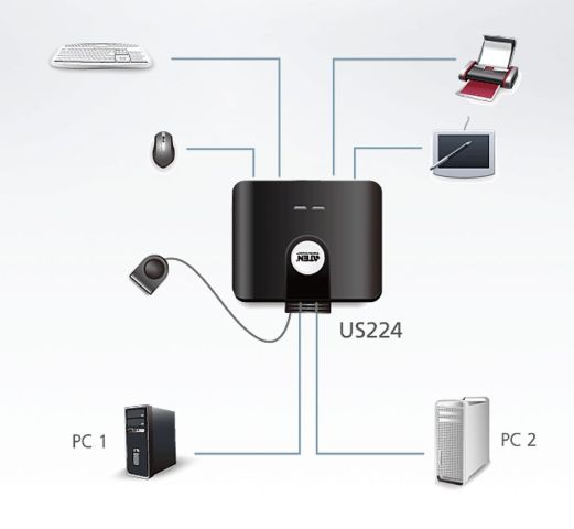 ATEN US224 partageur 4 peripheriques USB 2.0 pour 2 pc avec télécommande à bouton avec cordon 1.8m