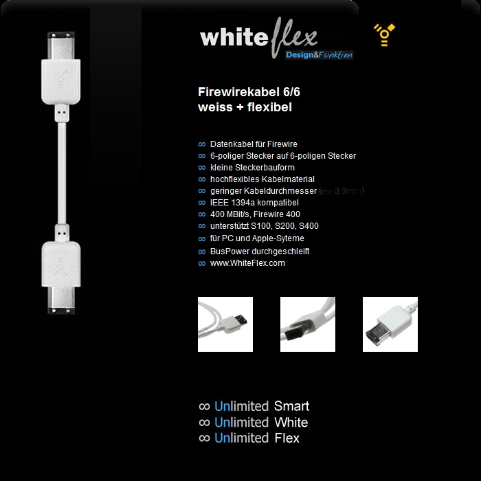 Câble FireWire 6/6 WHITEFLEX, 2 mètre, blanc, pour Mac/PC, cordon très flexible, 6 broches mâle - 6 broches mâle, 400 Mbps, compatibilité: Firewire 400, IEEE-1394a, S400, i.Link, DV, couleur: blanc